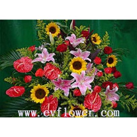 田園鮮花禮籃組合,包括向日葵、百合、紅掌、玫瑰、襯花及綠葉等,適合任何送禮場合。 |