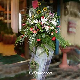 法式設計之奪目耀眼鮮花籃組合,包括向日葵、太陽花、百合、襯花及綠葉等,適合任何送禮場合。 |