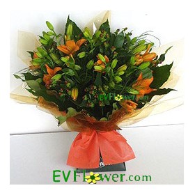 5枝金百合、荷蘭田園襯花及綠葉,華麗典雅,難以忘懷。 |