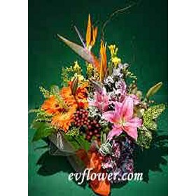French combination of beautiful flowers that light up the sky ( Lilies, Bird of Pardise, Gerberas, Matching Flowers and Greens ) in a country basket. |
