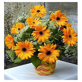 French combination of beautiful flowers that light up the sky ( Gerberas, Matching Flowers and Greens ) in a country basket. |