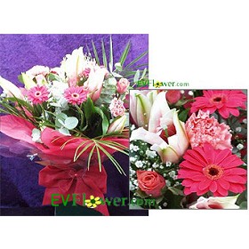 Stylish bouquet of 3pcs Roses, 2pcs Casa Blanca Lilies, 5pcs Gerberas, exotic Matching Flowers and Greens. |