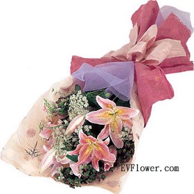 Stylish bouquet of 3pcs Lilies, exotic Matching Flowers and Greens. |