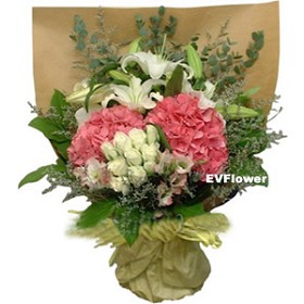 An exquisite choice of 11pcs Roses, 2pcs Hydrangea, 2pcs Casa Blanca Lilies and Greens in a colorful bouquet. |