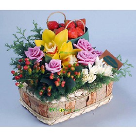 Fresh Strawberry, Roses and Matching Flowers in a classic basket, a memorable expression of endearment. |