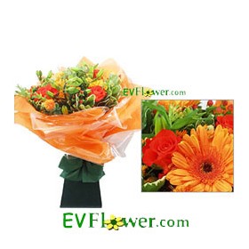 5朵太陽花、6朵雅麗玫瑰、小丁香、荷蘭田園襯花及綠葉,華麗典雅,難以忘懷。 |
