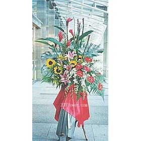 法式設計之奪目耀眼鮮花籃組合,包括百合、向日葵、紅掌、紅彊、紫尾、襯花及綠葉等,適合任何送禮場合。 |