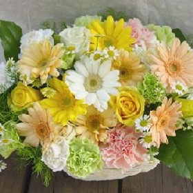 歐日式之田園鮮花禮籃,包括太陽花、玫瑰、康乃馨、荷蘭小菊、襯花及綠葉等,適合任何送禮場合。 |
