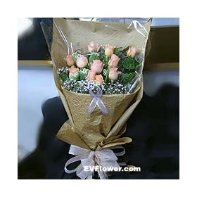 11朵玫瑰、無忘我、王孔雀、彩星、田園襯花及綠葉,華麗典雅,難以忘懷。 |