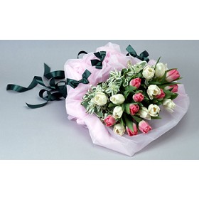 花束包括荷蘭鬱金香、田園雜錦襯花及綠葉等,簡潔典雅的花束。