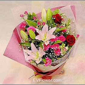 3朵百合、11朵雅麗玫瑰、荷蘭田園襯花及綠葉,華麗典雅,難以忘懷。 |