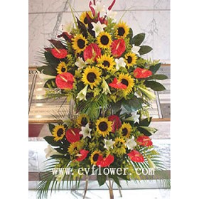 French combination of beautiful flowers that light up the sky ( Red Anthurium, Sunflowers, Lilies, Matching Flowers and Greens ) . |