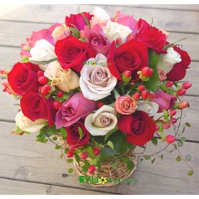 French combination of beautiful flowers that light up the sky ( Roses, Red beans, Matching Flowers and Greens ) in a country basket. |