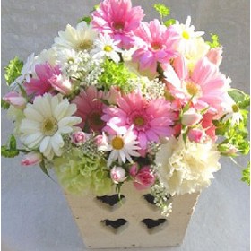 French combination of beautiful flowers that light up the sky ( Gerberas, Carnations, Daisies, Matching Flowers and Greens ) in a country basket. |