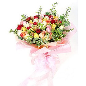 Stylish bouquet of 33pcs colorful Rose with matching flowers and greens. |