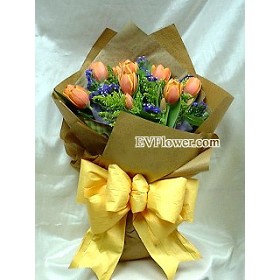 Stylish bouquet of 10pcs Tulips, exotic Matching Flowers and Greens. |