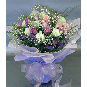 An exquisite choice of 12pcs Roses, exotic Matching Flowers and Greens in a colorful bouquet. |